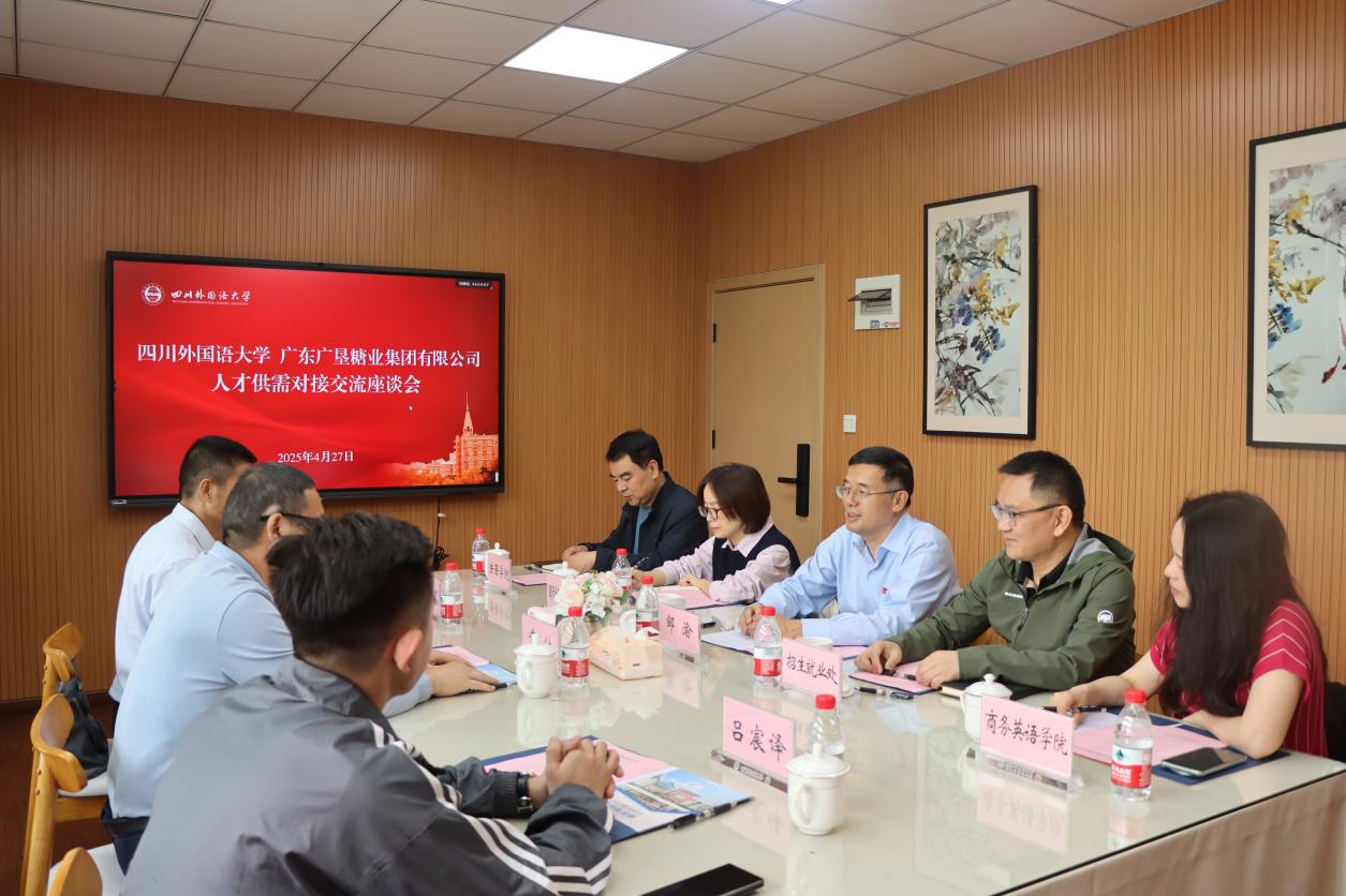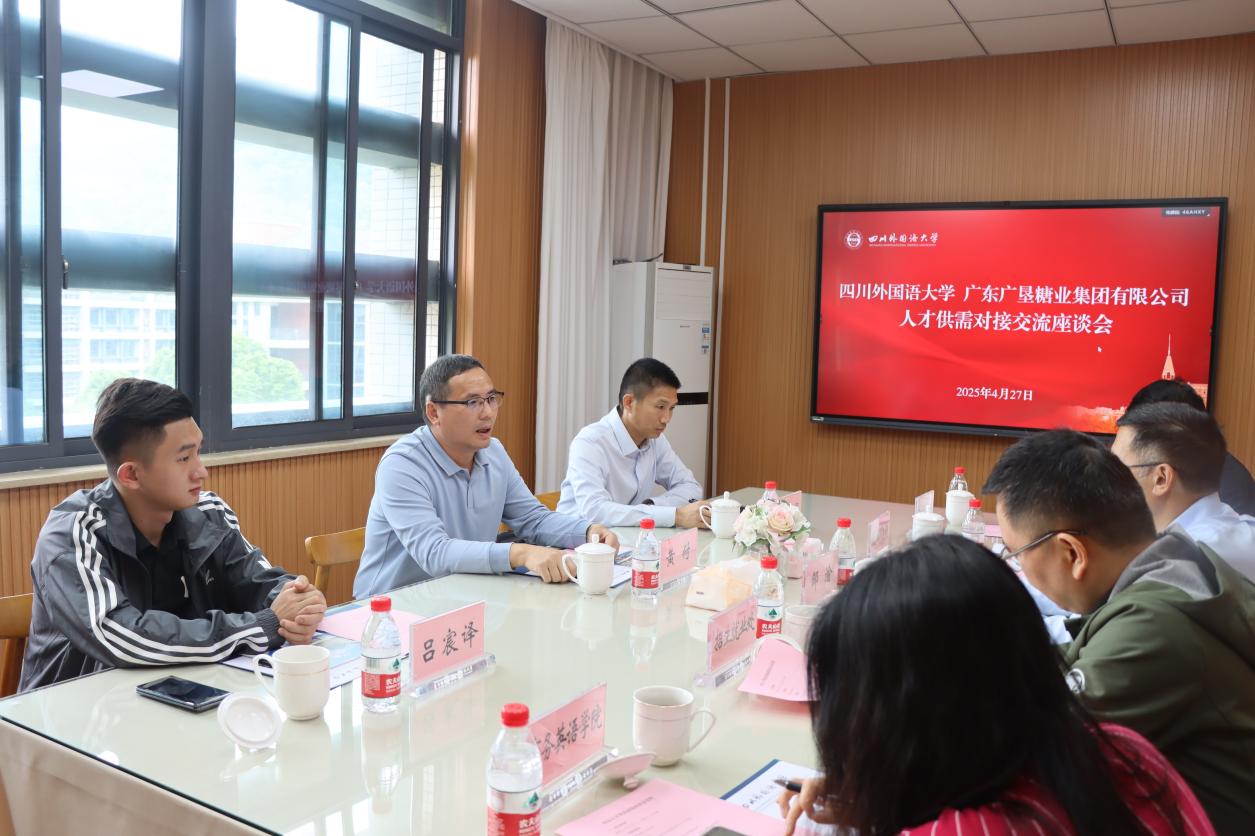 黄付介绍了广垦糖业的发展现状及人才需求。作为国内糖业龙头企业,广垦糖业业务涵盖甘蔗种植、制糖生产、国内外贸易等领域,产品畅销海内外。他详细阐述了集团对国际贸易、市场营销、语言翻译等人才的需求,并指出,随着国际化进程加快,企业亟需具备优秀外语能力、跨文化沟通能力及专业知识的复合型人才。黄付高度肯定川外毕业生的语言能力和专业素养,希望与学校建立长期人才合作机制,吸纳更多优秀学子,助力企业拓展国际市场。