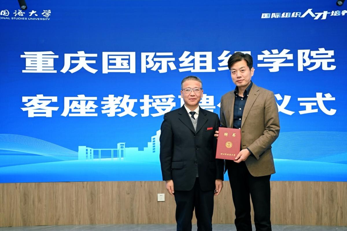 在重庆国际组织学院聘任仪式上,刘嗣方为中国人民大学国际组织学院副院长、国际发展研究所所长崔守军颁发客座教授聘书。