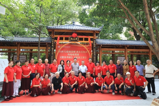 在“歌乐书廊”前,苟朝莉、王仁强为房永生、樊迎朝校友颁发捐赠证书;72级校友向赵崇新、陈泽先两位老师赠送书画礼物。校领导与校友们在“歌乐书廊”中门剪彩合影,校友情与师生情在此刻更加紧密凝聚。