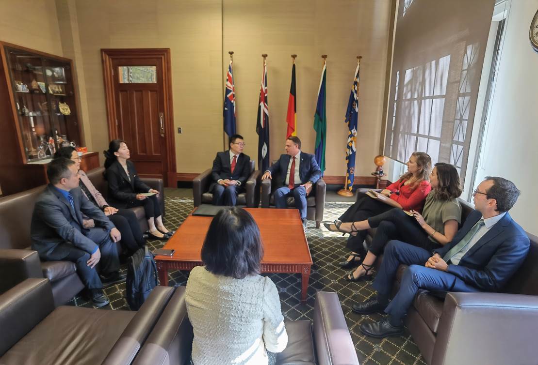 10日,川外访团来到布里斯班市政厅,拜访了布里斯班市长Adrian Schrinner、市政府国际处负责人Garth Henderson和昆士兰州教育厅国际处处长Jacinta Webb。布里斯班与重庆互为姊妹城市,Garth Henderson对川外访团的到来表示热烈欢迎,他介绍了昆士兰州和布里斯班市的情况,希望川外能对双城合作和昆士兰的国际教育提供支持,也邀请川外组织学生参加今年10月由布市举办的亚太城市峰会暨市长论坛之国际青年论坛。