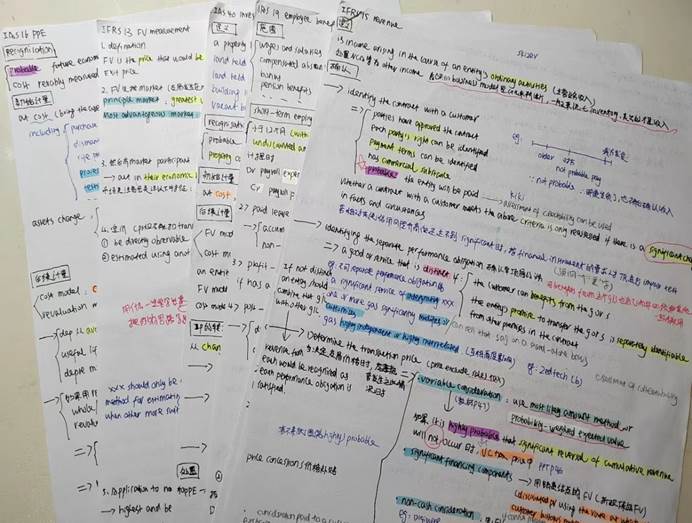 我一般会花半个月的时间拉通学完所有的知识点(ACCA卓越人才教改班会提供所有科目的网络课程、讲义、知识框架等),然后就开始第一遍做题。这时候我会分章节做,每个题型做三道,然后总结题型的规律并加以记忆。第一遍做完后,开始第二遍的刷题。这个时候追求的是效率,要在规定的时间内做完题目,在订正的同时要不断完善自己总结的规律。最后一遍是考试前一到两周,我会每天上午复习笔记,下午定时做练习巩固知识点。