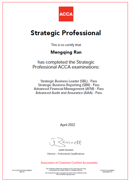 财务管理专业(ACCA卓越人才教改班)作为我院国家一流本科专业建设点,自2011年成立以来,历届学生优质就业率历年均位于全校前列,在英语成绩、专业比赛、实践实习、考研留学方面均表现优异。其中,也涌现了非常多的优秀学生,我院2019级ACCA教改班学生冉孟卿就是其中一位佼佼者。她在2022年3月的ACCA全球统考中通过了最后一门考试,成为国际工商管理学院ACCA项目办学十余年以来,用最短时间完成全科通过的同学。