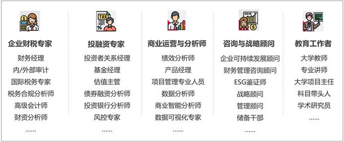 财务管理专业(ACCA方向)学生未来将拥有广阔的就业选择面,可在跨国公司、专业性会计师事务所、国企与金融机构等各类大型企事业单位从事财务、税务、商业分析、投融资、运营与管理等高薪职业。