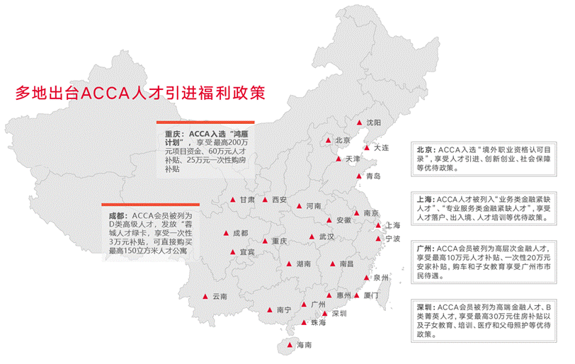 ACCA执业资格在国内被广泛认可,包括北京、上海、广州、深圳、成都、西安、重庆、天津、厦门等全国众多一二线城市均将ACCA持证人员列入当地高端紧缺金融人才目录,争相出台诸如积分落户、个税减免、专项奖金、置业补贴、子女入学等各项ACCA人才引进福利政策。
