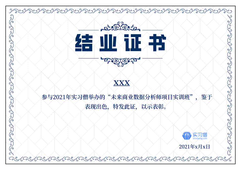 1. 通过项目考核可申请工业与信息化部颁发的“工业与信息化部专项技术认证证书——大数据分析师(中级)”证书。