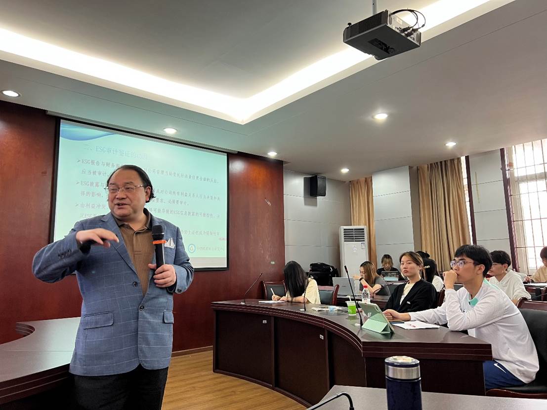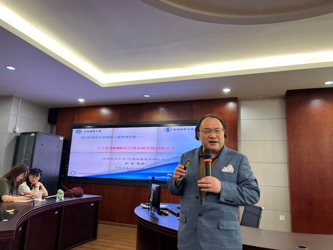 5月26日下午,中国政府审计研究中心主任、西南财经大学蔡春教授做客我院第十五期萃英学术论坛,在宏文楼国际商务实验中心5-8实验室作了题为“关于加强ESG审计理论研究的问题思考”的学术讲座。本次报告由国际工商管理学院代彬院长主持,财务管理和审计学专业的教师代表以及硕士生和本科生聆听了报告。