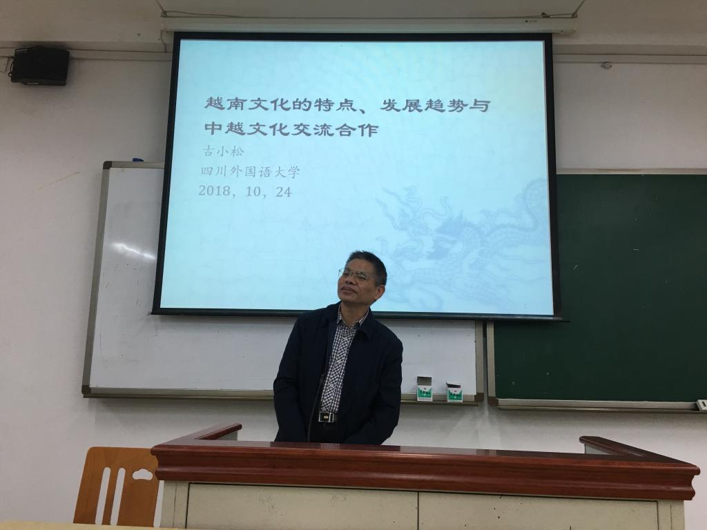 10月19日,广西社会科学研究员古小松博士应邀来到我校开展专题讲座,古小松博士长期致力于东南亚历史文化和越南问题的研究,目前担任全国东南亚研究会副会长,广西东南亚研究会会长,是全国宣传文化系统四个一批人才。古小松博士是广西具有突出贡献的科研人员,在东南亚文化研究领域造诣颇深,成果丰富。讲座分为两场,由我校越南语专业教师黄宪华主持。