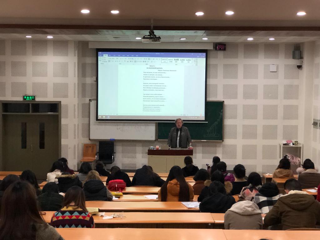 2018年11月18日晚7点,俄罗斯自然科学院院士、俄罗斯国立人文大学教授伊戈尔·瓦基莫维奇·康达科夫为俄语系师生做了系列讲座第一场——《作为统一文本的19-20世纪俄罗斯诗歌》,在我校西区教学楼B1-1举行,讲座由俄语系主任徐曼琳教授主持。