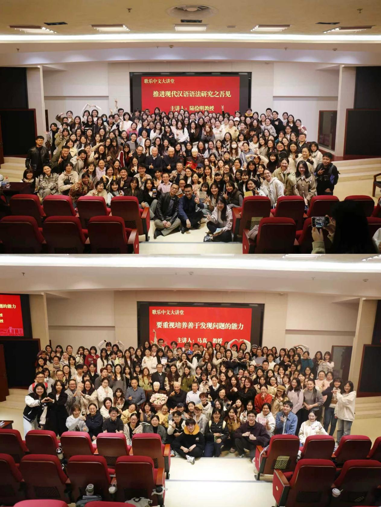 活动伊始,原定的立德楼A609报告厅座无虚席,六楼走廊也挤满了慕名而来的听众,现场热度远超预期,主办方临时将讲座转至图书馆报告厅。途中,陆俭明教授、马真教授被学子们围拢请求签名、合影,互动氛围热烈;部分未能进入主会场的听众通过直播同步学习,全场学术热情高涨。